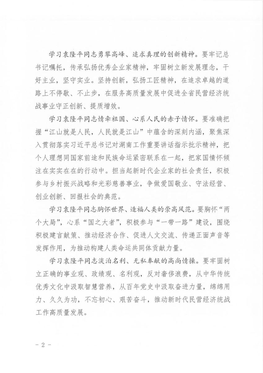 學習袁隆平同志勇攀高峰、追求真理的創(chuàng)新精神。要牢記總書記囑托,傳承弘揚優(yōu)秀企業(yè)家精神,牢固樹立新發(fā)展理念,干好主業(yè),堅守實業(yè)。堅持創(chuàng)新,弘揚工匠精神,在追求卓越的道路上不停歇、不止步,在服務高質(zhì)量發(fā)展中促進全省民營經(jīng)濟統(tǒng)戰(zhàn)事業(yè)守正創(chuàng)新、提質(zhì)增效。