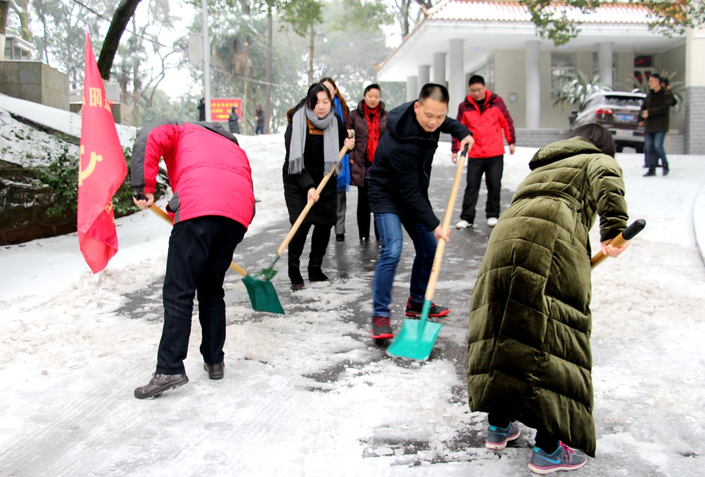 冷風(fēng)中,大家不畏嚴(yán)寒,用鐵鍬、掃把清掃路上的積雪,熱火朝天的勞動(dòng)場面讓嚴(yán)寒的天氣顯得暖意濃濃,皚皚白雪下一個(gè)個(gè)忙碌的身影也展現(xiàn)出了政協(xié)機(jī)關(guān)的風(fēng)采。在大家的共同努力下,厚厚的積雪向兩邊“散”去,一條清晰的路面顯現(xiàn)出來。